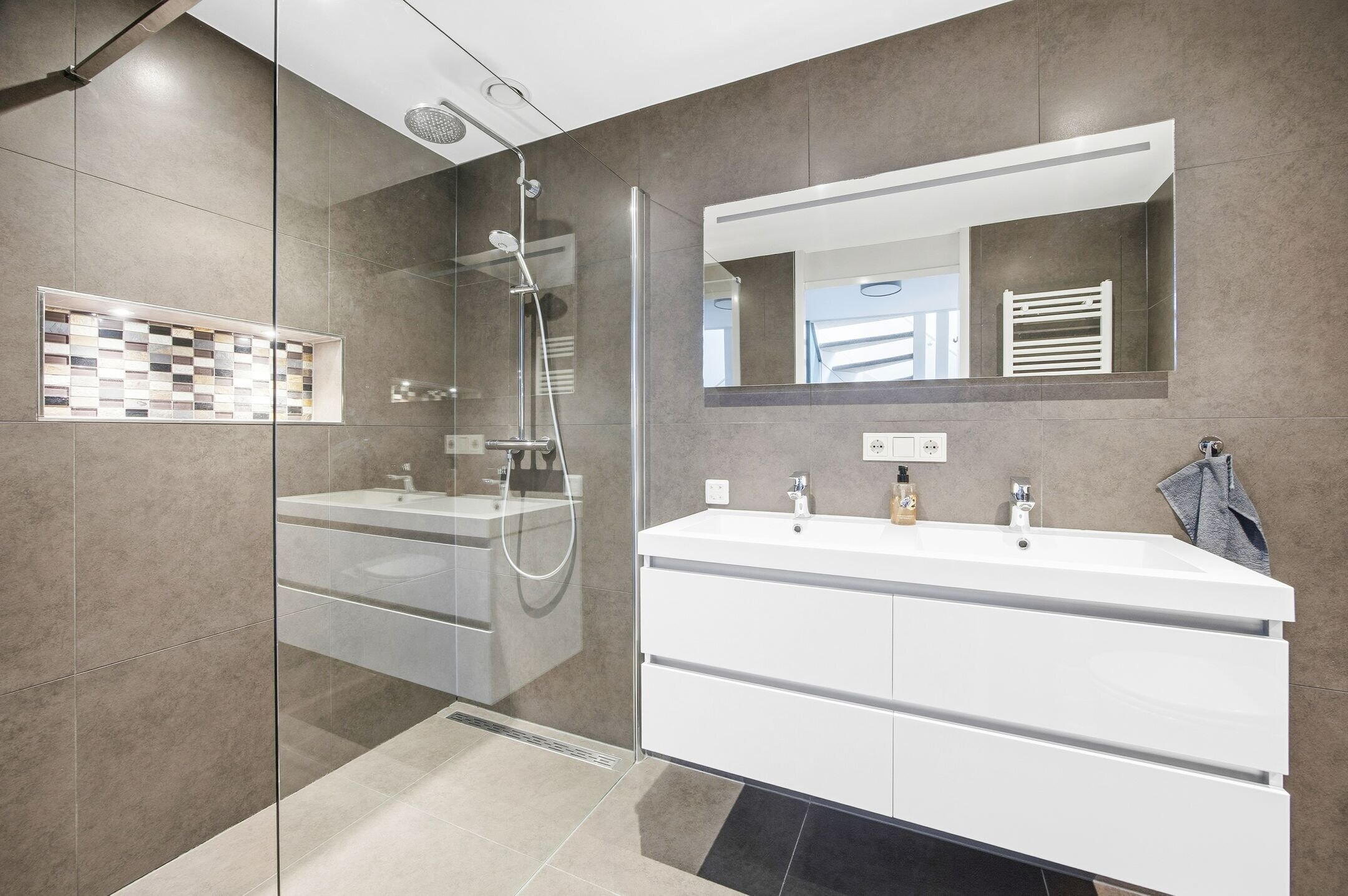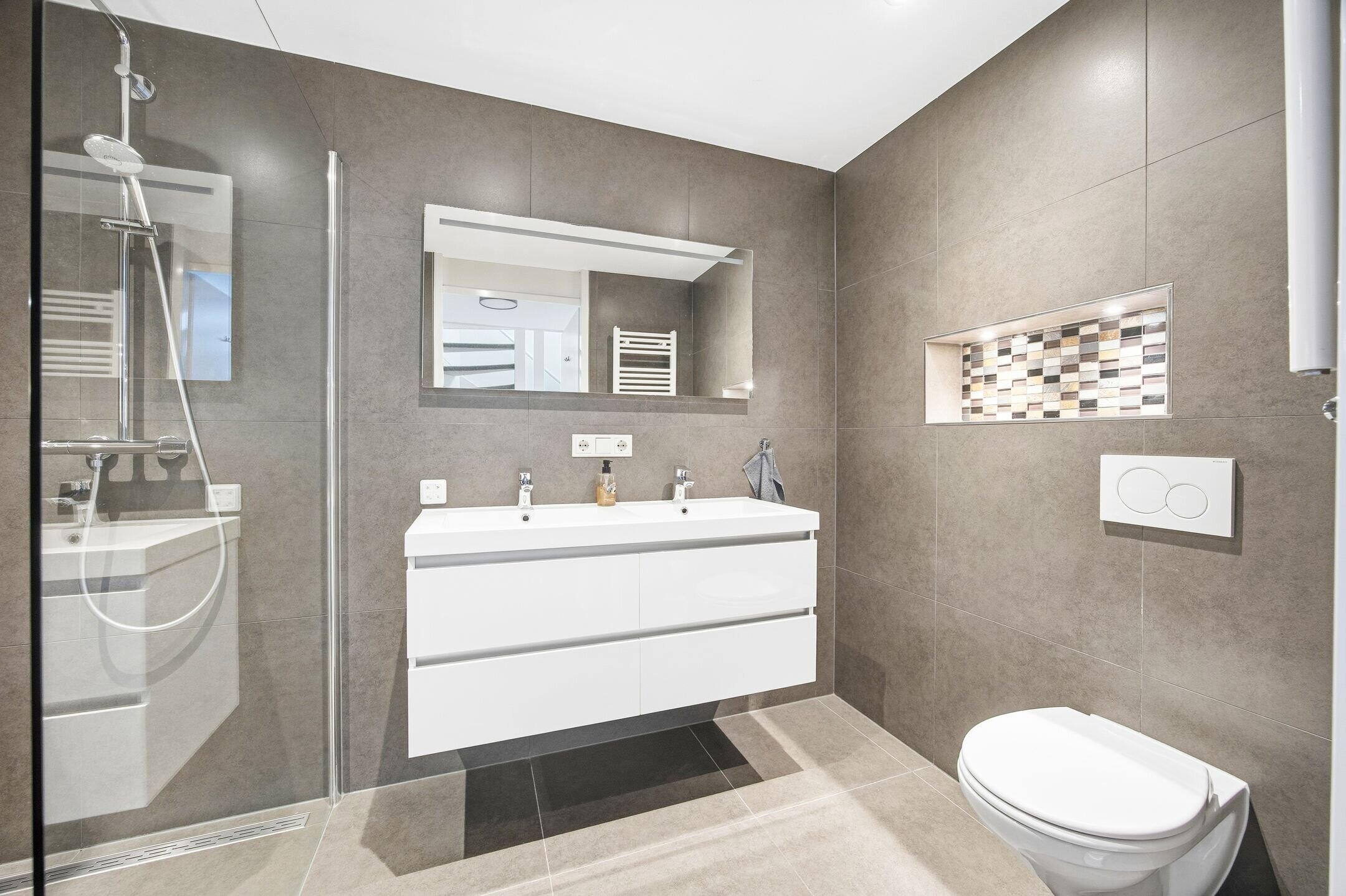 Overloop, kast met opstelplaats CV ketel en MV, voorslaapkamer met vaste kastenwand, luxe moderne badkamer voorzien van inloopdouche, dubbele wastafel in meubel met spiegel voorzien van verlichting, hangend toilet en design radiator, achter slaapkamer en achterzij slaapkamer