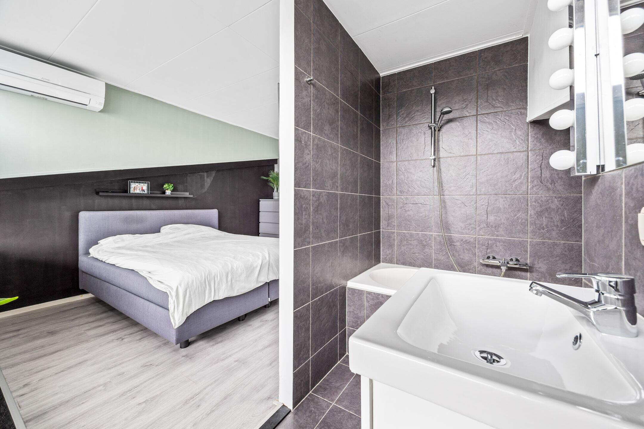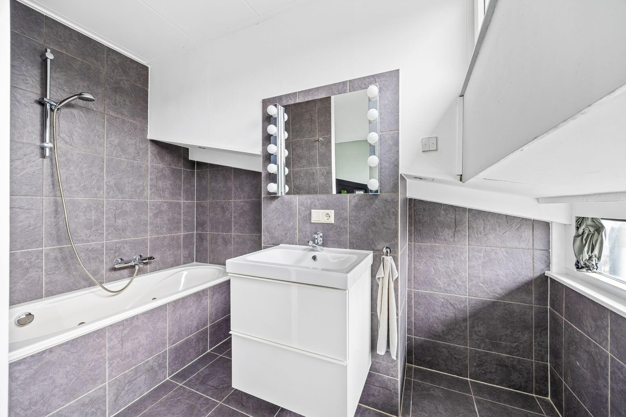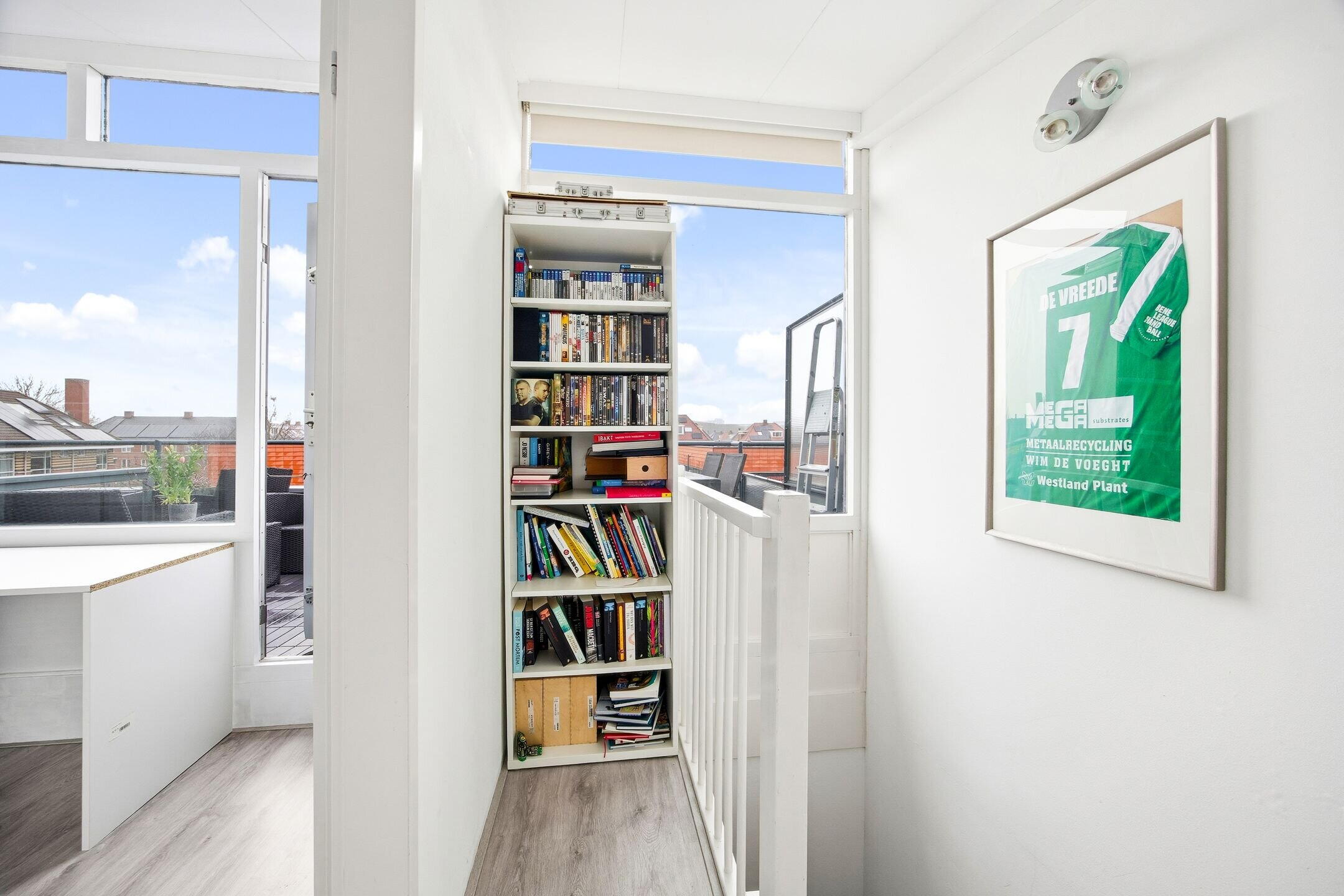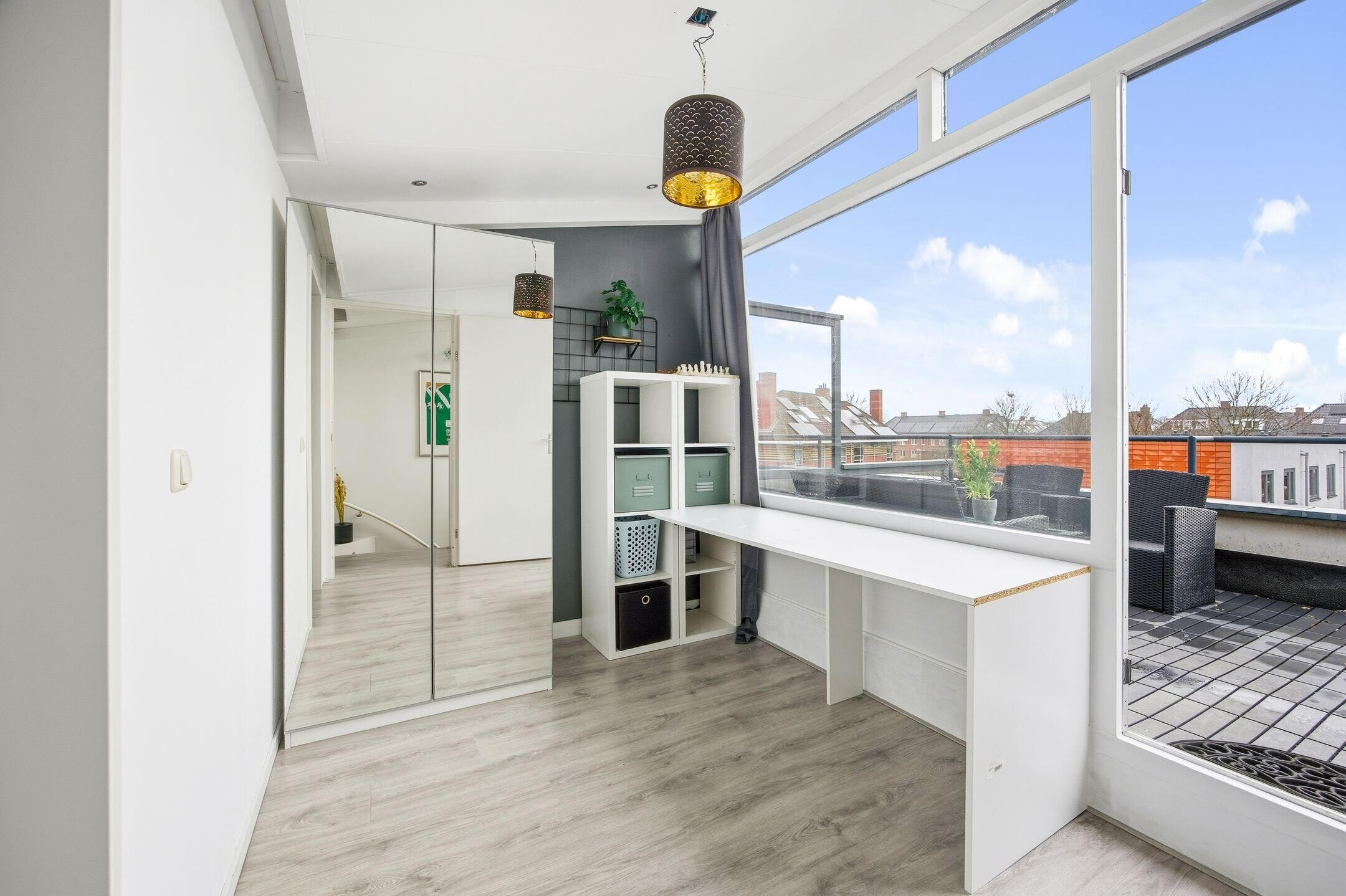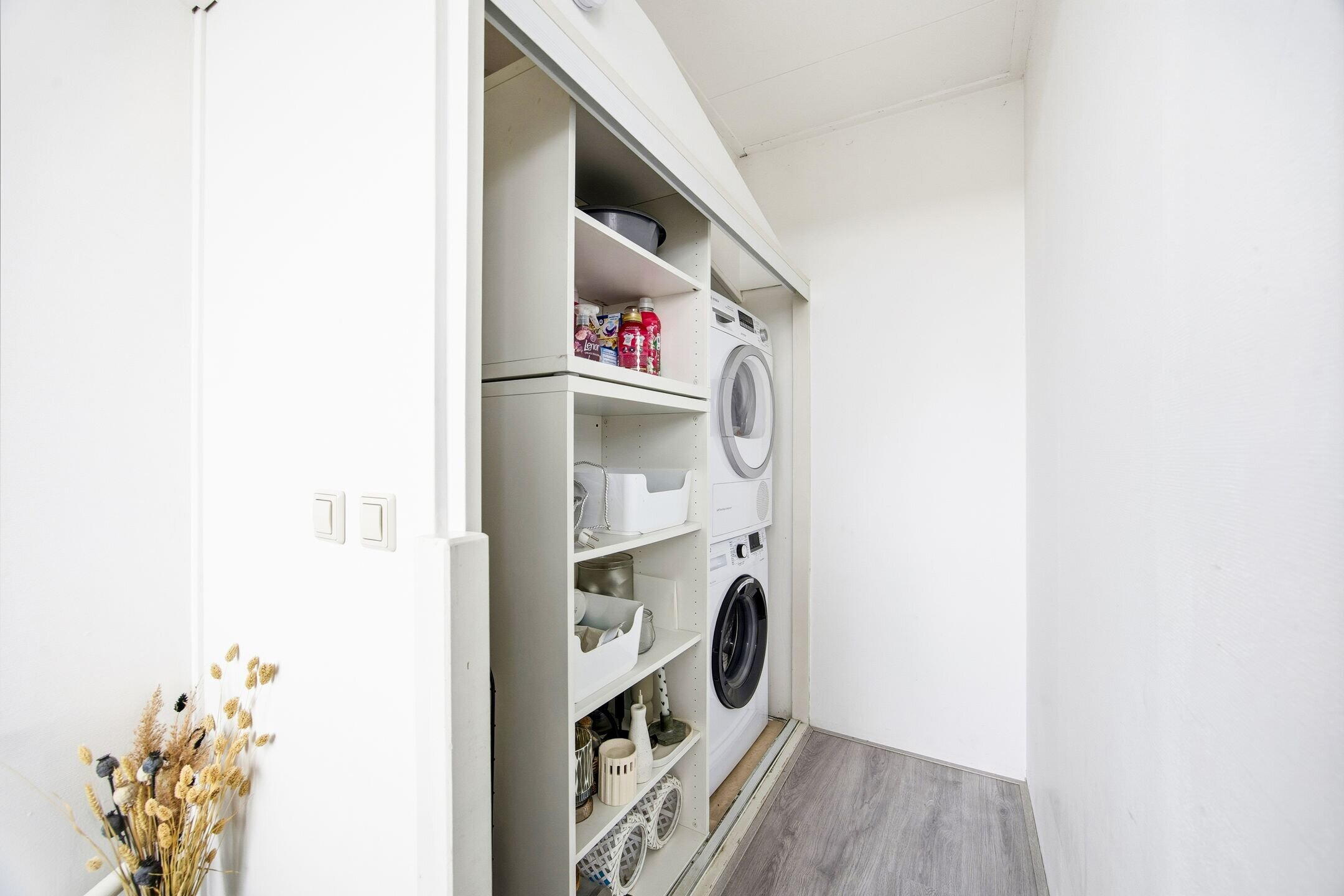 Overloop ,met kast voor wasmachine en droger, slaapkamer, badkamer voorzien van bad, wastafel in meubel, dakterras bereikbaar middels openslaande deur.