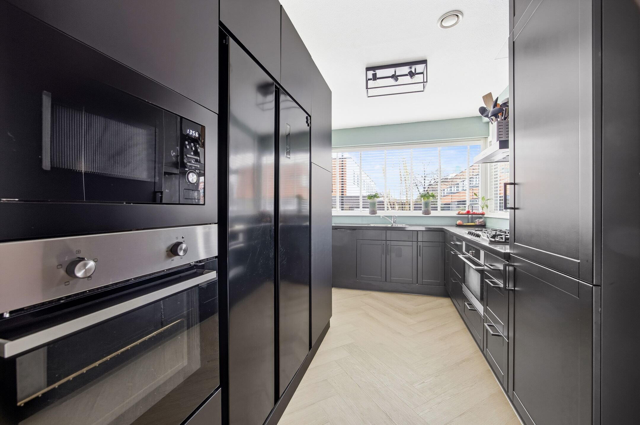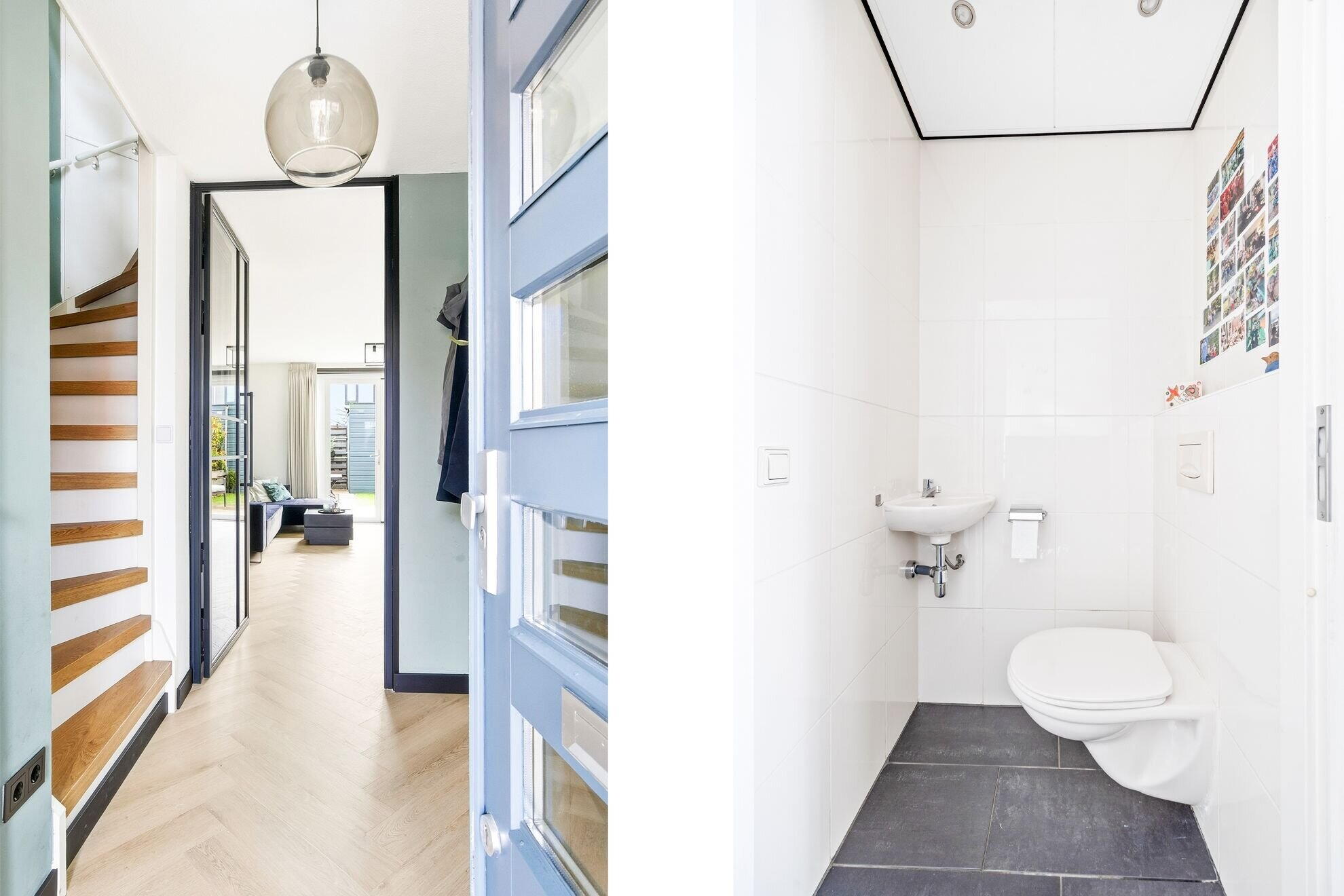Voortuin, entree woning, modern hangend toilet met een fonteintje, meterkast, tuingerichte woonkamer voorzien van visgraad vloer, trapkast, moderne open keuken aan de voorzijde in L-opstelling voorzien van hardstenen aanrechtblad, 5-pits gasfornuis, koel- en vrieskast, combi magnetron, afzuigkap en vaatwasmachine. Vanuit de woonkamer heeft u door middel van de openslaande deuren toegang tot de zonnige achtertuin op het zuidwest gelegen. Voorzien van buitenkraan, met achterom en een ruime berging voorzien van elektra.
